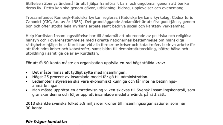 Svensk Insamlingskontroll har beviljat 90-konto åt Stiftelsen Zonny, Trossamfundet Romersk-Katolska kyrkan och Help Kurdistan Insamlingsstiftelse.