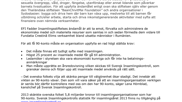 Svensk Insamlingskontroll har beviljat 90-konto åt Insamlingsstiftelsen ChildFriend och EFI Fadder Insamlingsstiftelse.