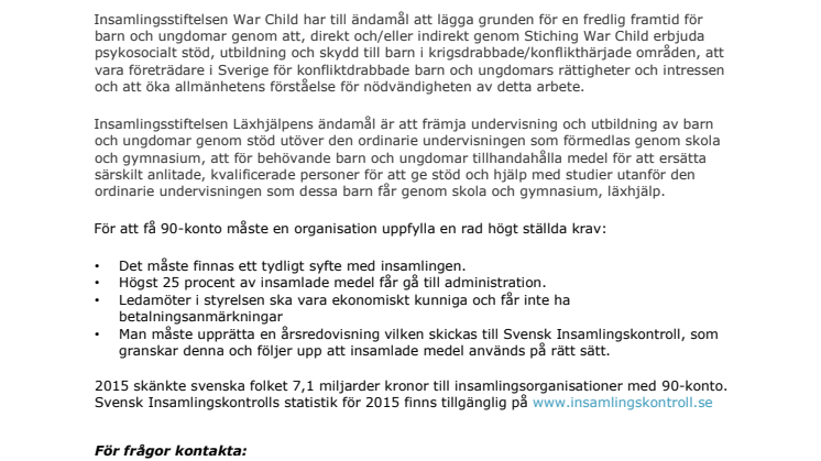 Svensk Insamlingskontroll har beviljat 90-konto åt Insamlingsstiftelsen War Child och Insamlingsstiftelsen Läxhjälpen.