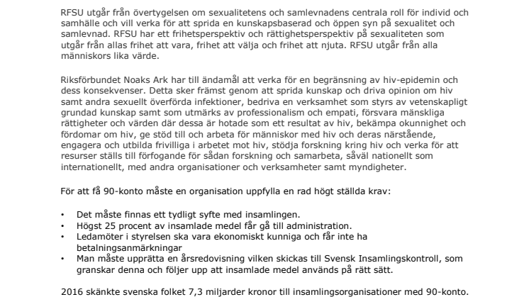 Svensk Insamlingskontroll har beviljat 90-konto åt RFSU, Riksförbundet för Sexuell Upplysning och Riksförbundet Noaks Ark.