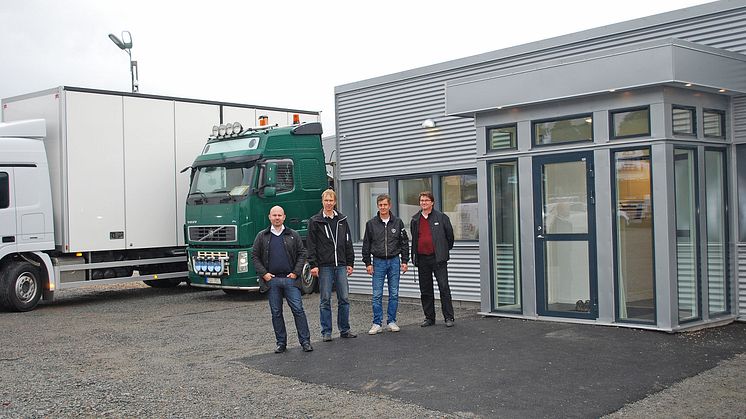 Bildtext: Framför nya Bilmetro Truckshop från vänster Henrik Fredriksson, försäljningssamordnare Bilmetro Lastbilar, Anders Håkansson, platsansvarig/säljare, Roger Andersson, säljare, och Ulric Carlsson, säljare.