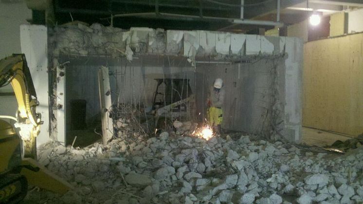 Som underentrepenör åt Stabag AB, fick Pierre Entreprenad det utmanande jobbet att riva det stora bankvalvet. Med hjälp av rivningsrobotar och kompaktlastare har de klippt ned och bilat 600 millimeter kraftigt armerade betongväggar och betongvalv.