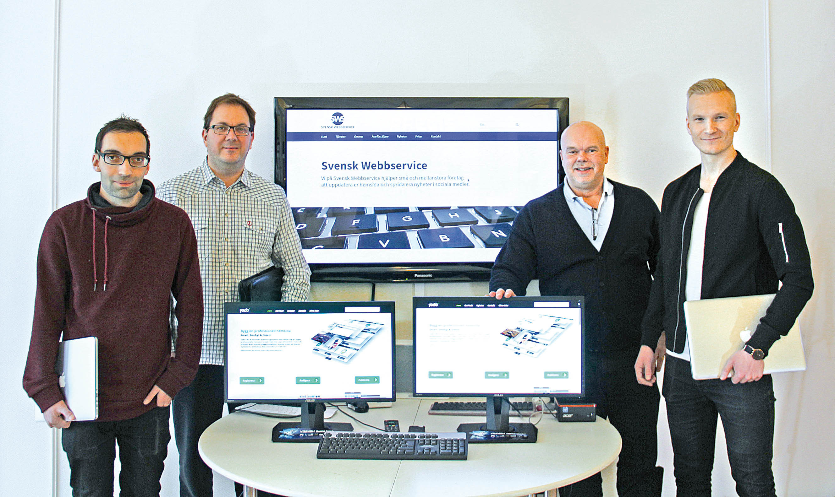 Grundarna av Presstjänst fr.v. Henrik Dahl, Stefan Wennberg, Joe Formgren och Emanuel Golabiewski på Precis Reklam i Gävle.