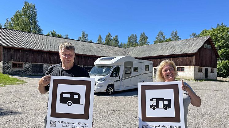 Bildtext: Axmar Bryggas ägare Yngve Persson hälsar både husbilar och husvagnar välkomna till Axmar bruk tillsammans med husbilsentusiasten Ingela Gustafson.