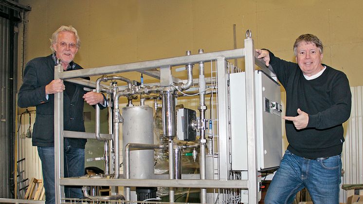 Bildtext: Innovatörerna Sten-Åke "Stenna" Holmström och Torsten Bauer med den nya vattenrenaren innan den levererades till kärnkraftindustrin.