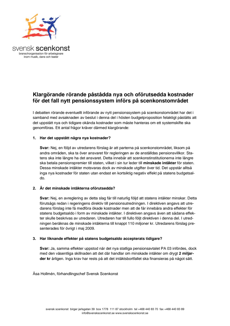 Klargörande rörande påstådda nya och oförutsedda kostnader för det fall nytt pensionssystem införs på scenkonstområdet