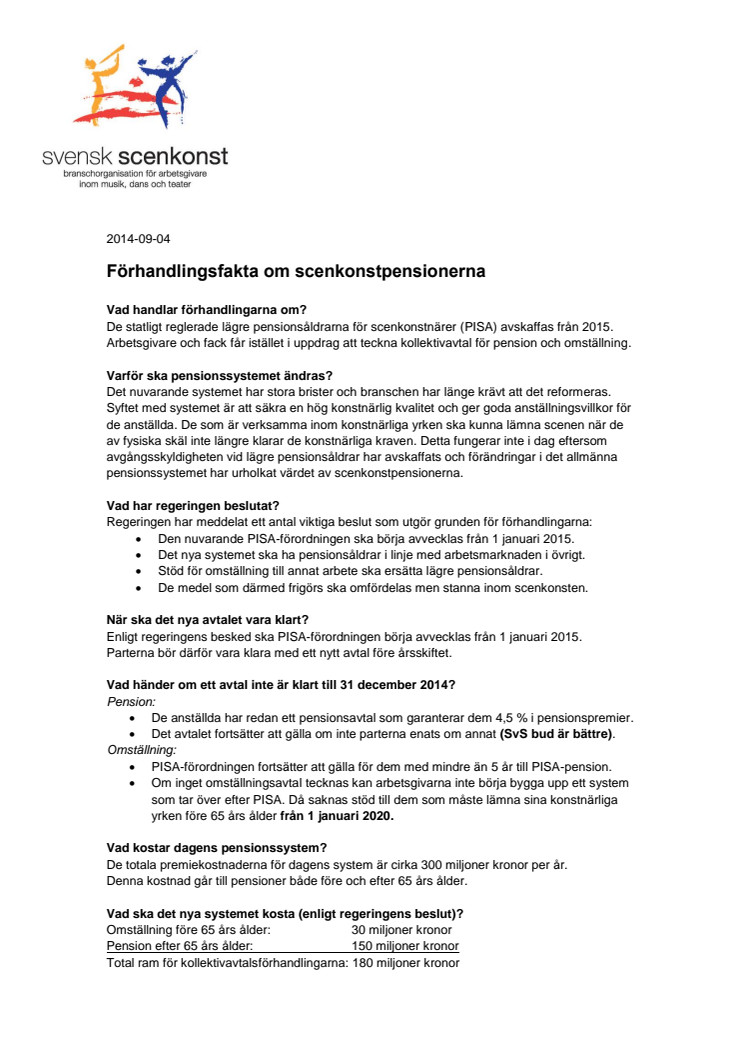 • Klargörande rörande påstådda nya och oförutsedda kostnader för det fall nytt pensionssystem införs på scenkonstområdet