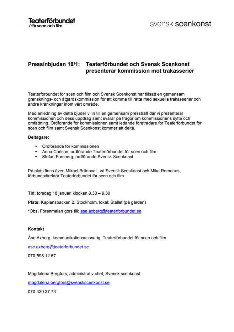 Pressinbjudan 18/1: Teaterförbundet och Svensk Scenkonst presenterar kommission mot trakasserier