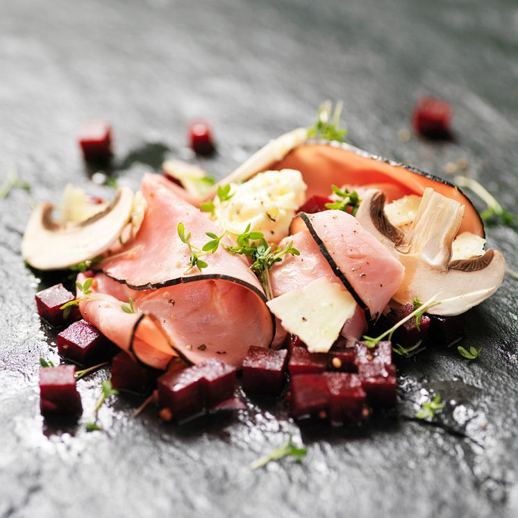 Rökt skinka med ostkräm, champinjoner, ättiksbetor och smulade potatischips