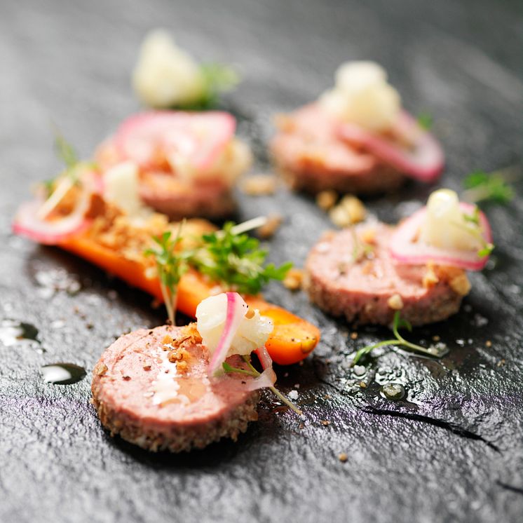Skivad leverpastej med picklade grönsaker, rostad lök och krasse