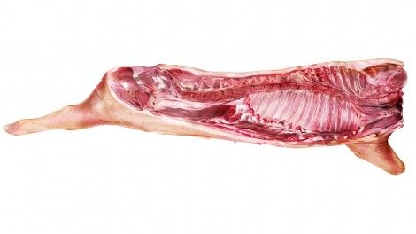 Eric visar hel färsk skinka, som har många användningsområden. Eric berättar om att grisens framdelskött har ett mer insprängt fett och bakdelsköttet mer utanpåliggande fett. Tänk på att välja en detalj med mycket fett, eftersom fettet sitter i smaken.