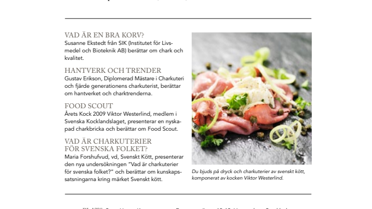 Genom Food Scout över hela Sverige uppmärksammas nu allt fler regionala charkuterier. En ny undersökning visar att svenskarna har sina klara smakfavoriter. Svenskt Kött bjuder in till några timmars information, inspiration och tips om hur du sätter samman en svensk charktallrik.