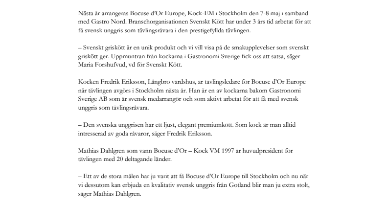 Nästa år arrangeras Bocuse d’Or Europe, Kock-EM i Stockholm den 7-8 maj i samband med Gastro Nord. Branschorganisationen Svenskt Kött har under 3 års tid arbetat för att få svensk unggris som tävlingsråvara i den prestigefyllda tävlingen.