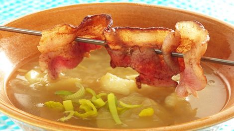 Potatis och purjolökssoppa med fläsk på spett, 4 portioner