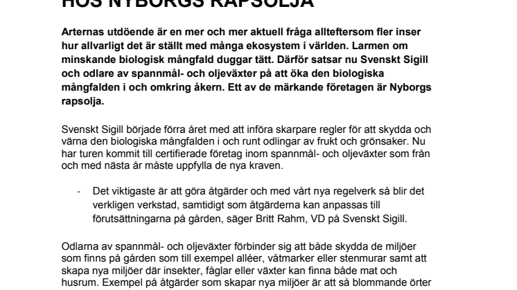 Arternas utdöende är en mer och mer aktuell fråga allteftersom fler inser hur allvarligt det är ställt med många ekosystem i världen. Larmen om minskande biologisk mångfald duggar tätt. Därför satsar nu Svenskt Sigill och odlare av spannmål- och oljeväxter på att öka den biologiska mångfalden i och omkring åkern. Ett av de märkande företagen är Nyborgs rapsolja.