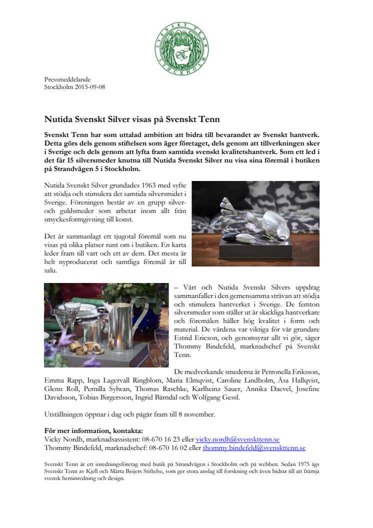 Svenskt Tenn har som uttalad ambition att bidra till bevarandet av svenskt hantverk. Detta görs dels genom stiftelsen som äger företaget, dels genom att tillverkningen sker i Sverige och dels genom att lyfta fram samtida svenskt kvalitetshantverk. Som ett led i det får 15 silversmeder knutna till Nutida Svenskt Silver nu visa sina föremål i butiken på Strandvägen 5 i Stockholm.