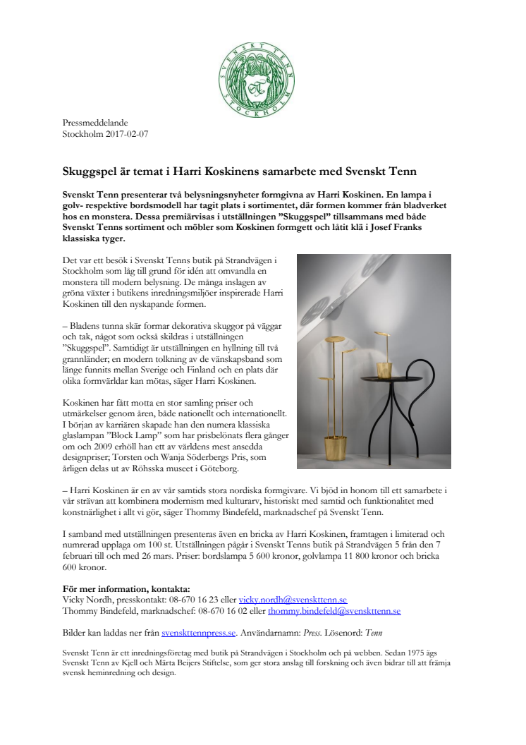 I samband med utställningen presenteras även en bricka av Harri Koskinen, framtagen i limiterad och numrerad upplaga om 100 st. Utställningen pågår i Svenskt Tenns butik på Strandvägen 5 från den 7 februari till och med 26 mars. Priser: bordslampa 5 600 kronor, golvlampa 11 800 kronor och bricka 600 kronor.