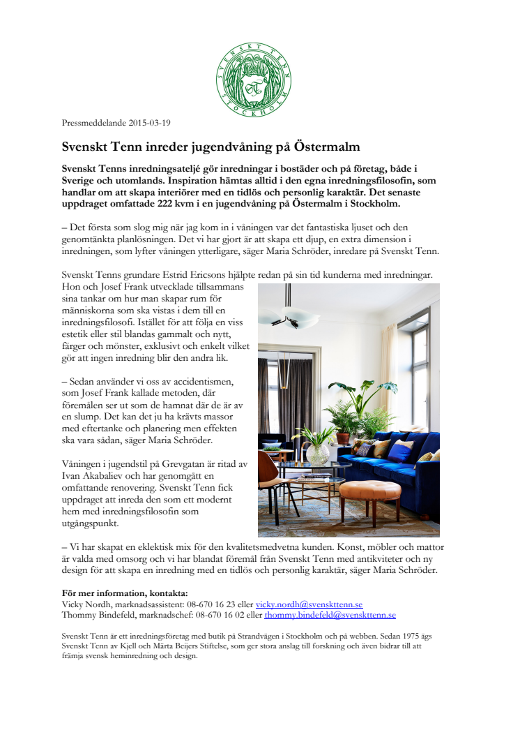 Svenskt Tenns inredningsateljé gör inredningar i bostäder och på företag, både i Sverige och utomlands. Inspiration hämtas alltid i den egna inredningsfilosofin, som handlar om att skapa interiörer med en tidlös och personlig karaktär. Det senaste uppdraget omfattade 222 kvm i en jugendvåning på Östermalm i Stockholm.