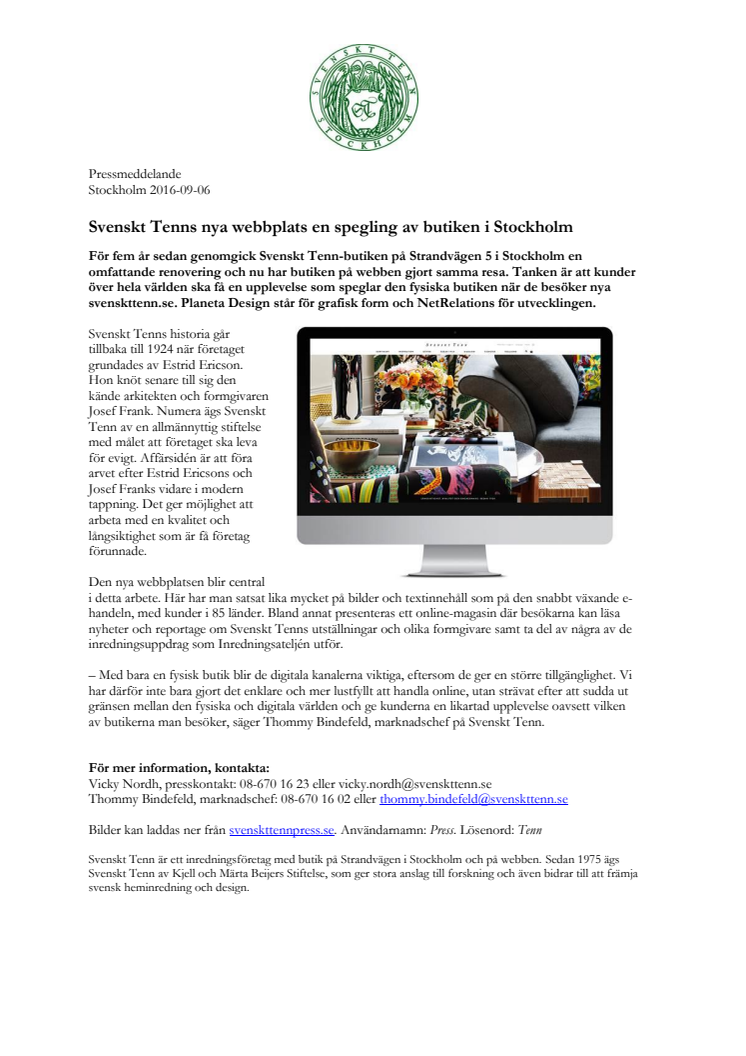 För fem år sedan genomgick Svenskt Tenn-butiken på Strandvägen 5 i Stockholm en omfattande renovering och nu har butiken på webben gjort samma resa. Tanken är att kunder över hela världen ska få en upplevelse som speglar den fysiska butiken när de besöker nya svenskttenn.se. Planeta Design står för grafisk form och NetRelations för utvecklingen.