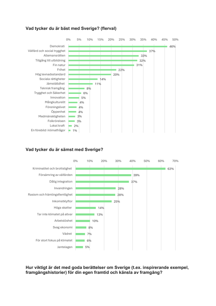 - 46% tycker att det bästa med Sverige är demokrati, följt av välfärd och social trygghet (37%) och Allemansrätten (33%).