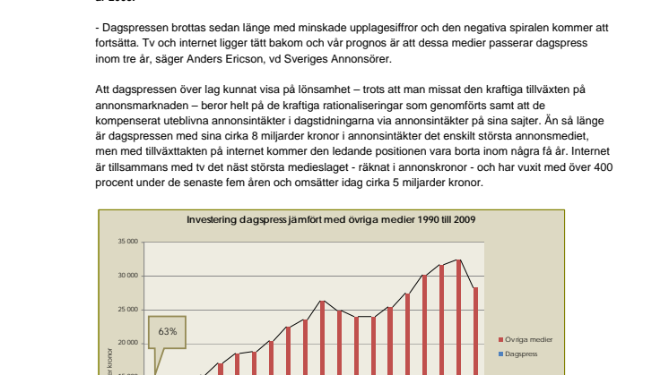 - Dagspressen brottas sedan länge med minskade upplagesiffror och den negativa spiralen kommer att fortsätta. Tv och internet ligger tätt bakom och vår prognos är att dessa medier passerar dagspress inom tre år, säger Anders Ericson, vd Sveriges Annonsörer.