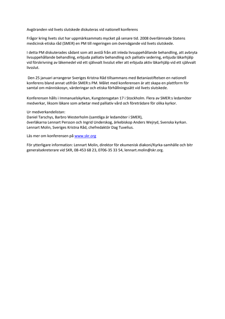 Frågor kring livets slut uppmärksammas alltmer. 2008 överlämnade Statens medicinsk-etiska råd en PM till regeringen om överväganden vid livets slutskede.Den 25 januari arrangerar SKR en konferens bland annat utifrån SMER:s PM. Målet är att skapa en plattform för samtal om människosyn, värderingar och etik vid livets slutskede. Konferensen hålls i Immanuelskyrkan, Kungstensgatan 17 i Stockholm.