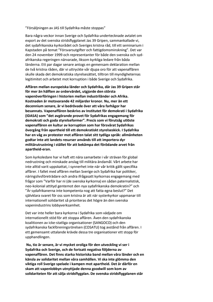 "Försäljningen av JAS till Sydafrika måste stoppas"
