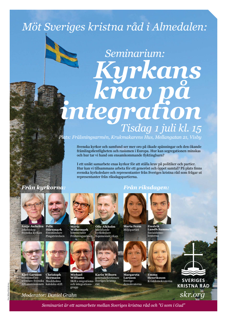 Under Almedalsveckan fokuserar landets kyrkor på integration och migration i ett gemensamt seminarium. Pingstledaren Pelle Hörnmark och ärkebiskop Antje Jackelén är två av kyrkoledarna som frågar ut riksdagsledamöter, däribland miljöpartisten Maria Ferm och sverigedemokraten Margareta Larsson.