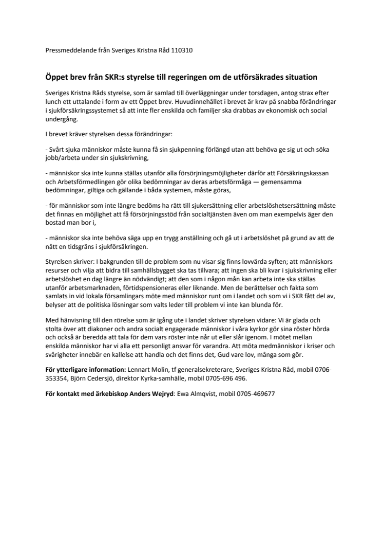 Sveriges Kristna Råds styrelse, som är samlad till överläggningar under torsdagen, antog strax efter lunch ett uttalande i form av ett Öppet brev. Huvudinnehållet i brevet är krav på snabba förändringar i sjukförsäkringssystemet så att inte fler enskilda och familjer ska drabbas av ekonomisk och social undergång.