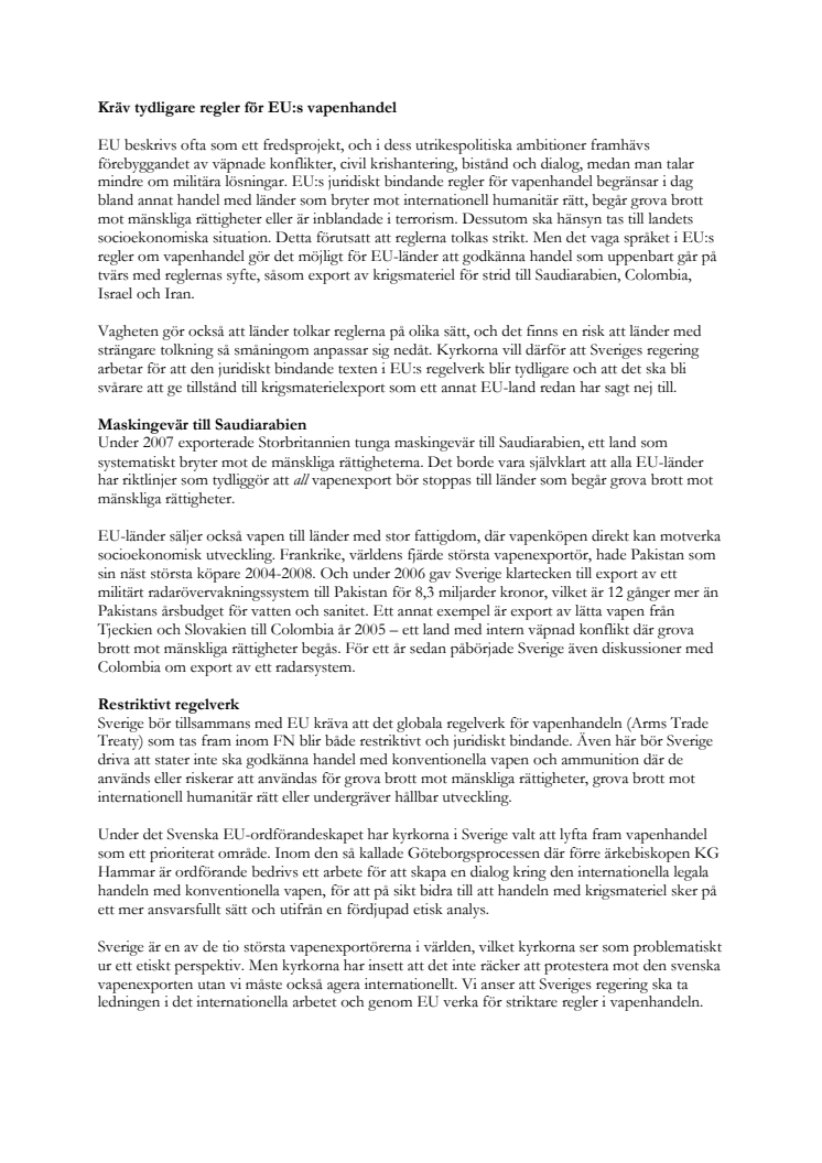 Den 28-29 september möts EU:s försvarsministrar i Göteborg för att diskutera EU:s försvarspolitiska samarbete. Försvarsminister Sten Tolgfors bör då ta upp frågan om att EU:s regelverk för vapenhandel måste bli tydligare. Reglerna måste kunna hindra EU-länderna från att handla med länder i krig, där grova brott mot mänskliga rättigheter begås eller där krigsmaterial går före fattigdomsbekämpning.