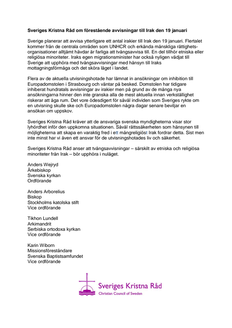 Sveriges Kristna Råd om förestående avvisningar till Irak den 19 januari