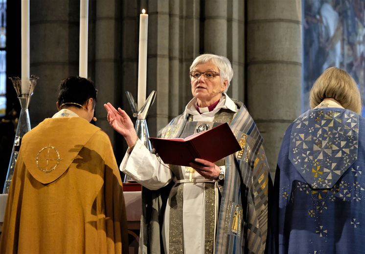 Ärkebiskop Antje Jackelén ber i gudstjänsten.