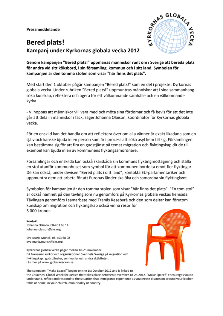 Genom kampanjen ”Bered plats!” uppmanas människor runt om i Sverige att bereda plats för andra vid sitt köksbord, i sin församling, kommun och i Sverige. Symbolen för kampanjen är den tomma stolen som visar "här finns det plats".