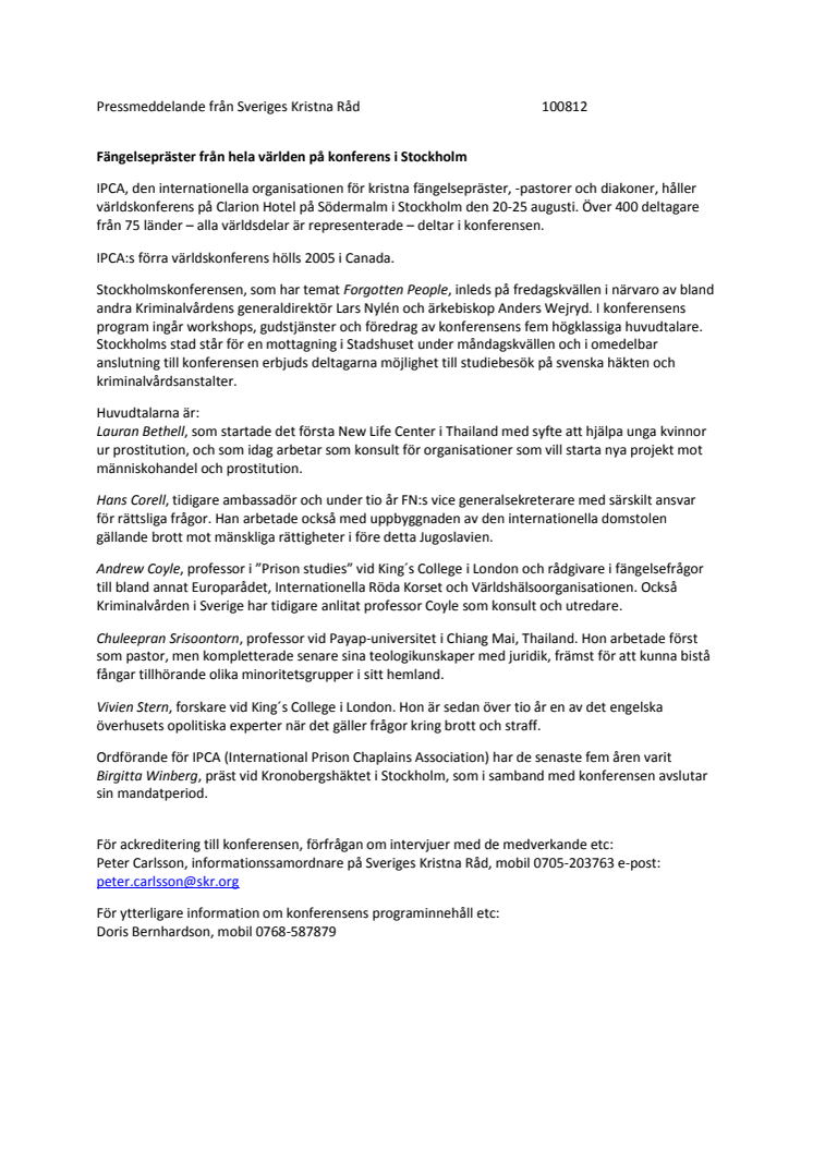 Peter Carlsson, informationssamordnare på Sveriges Kristna Råd, mobil 0705-203763, e-post: peter.carlsson@skr.org