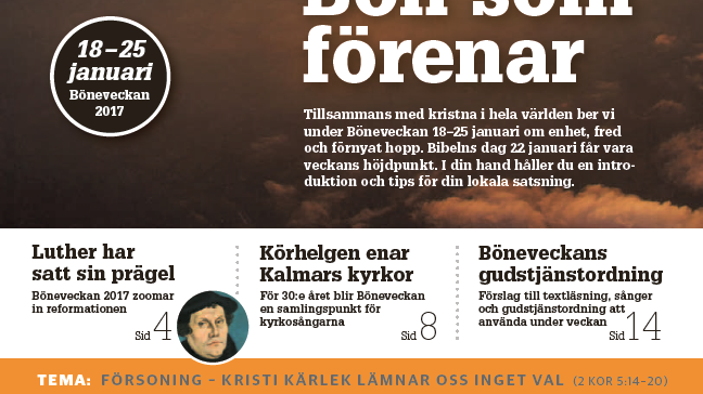 Böneveckan är världens största ekumeniska manifestation som genomförs samtidigt i cirka 75 länder. Sveriges kristna råd och Svenska bibelsällskapet översätter och bearbetar det internationella grundmaterialet. Just i år präglas materialet av reformationsminnet. Det har arbetats fram av en grupp på uppdrag av Tysklands kristna råd och temat de valt är Försoning – Kristi kärlek lämnar oss inget val (Andra Korinthierbrevet 5:14–20).