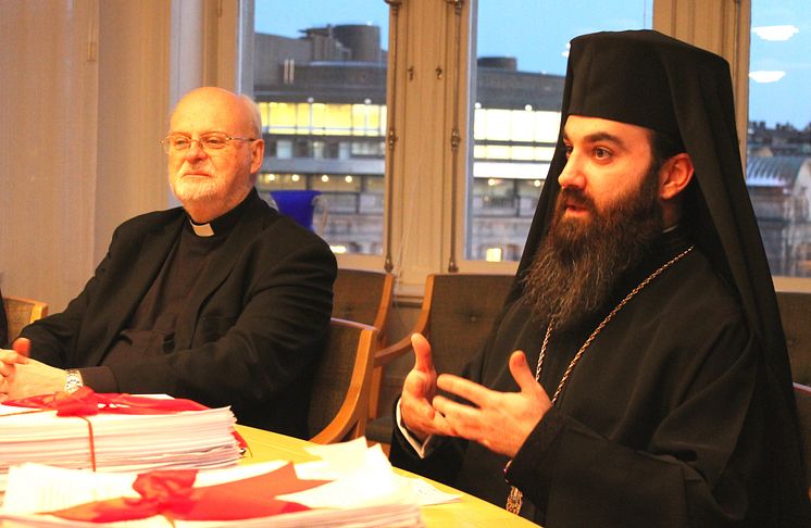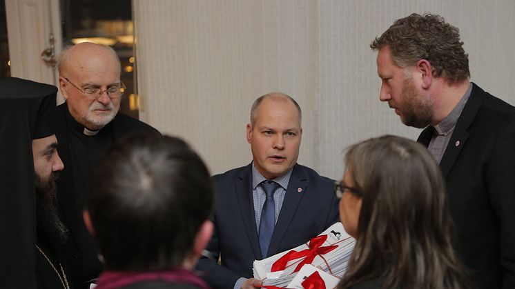 Lasse Svensson, kyrkoledare, Equmeniakyrkan och ordförande för Sveriges kristna råd, Anders Arborelius, biskop, Stockholms katolska stift, Jean Mansour, arkimandrit, Grekisk-ortodoxa kyrkan av Antiokia, Jenny Sjögreen, ekumenikchef, Svenska kyrkan, Karin Wiborn, generalsekreterare, Sveriges kristna råd, Mikael Stjernberg, kommunikationsansvarig, Sveriges kristna råd, Anders Malmstigen, generalsekreterare Svenska missionsrådet, Mattias Ingesson, ordförande Svenska missionsrådet.