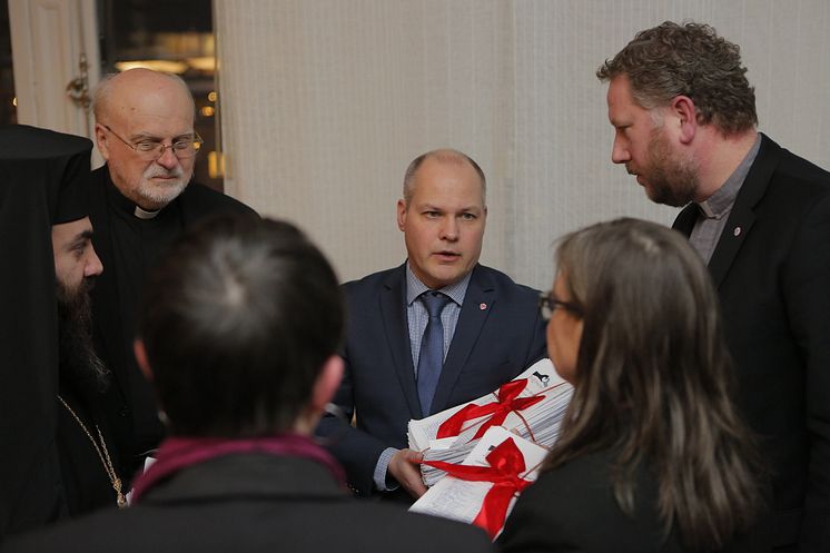 Representanter för kyrkorna och Svenska missionsrådet mötte migrationsminister Morgan Johansson på Rosenbad under tisdagseftermiddagen för att överlämna tre tjocka buntar av namnlistor. Bland kyrkoledarna fanns Anders Arborelius, biskop i Stockholms katolska stift: