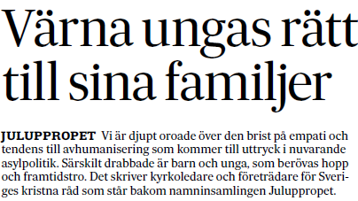 JULUPPROPET. Vi är djupt oroade över den brist på empati och tendens till avhumanisering som kommer till uttryck i den nuvarande asylpolitiken. Särskilt drabbade är barn och unga, som berövas hopp och framtidstro. Det skriver kyrkoledare och företrädare för Sveriges kristna råd som står bakom den aktuella namninsamlingen Juluppropet.