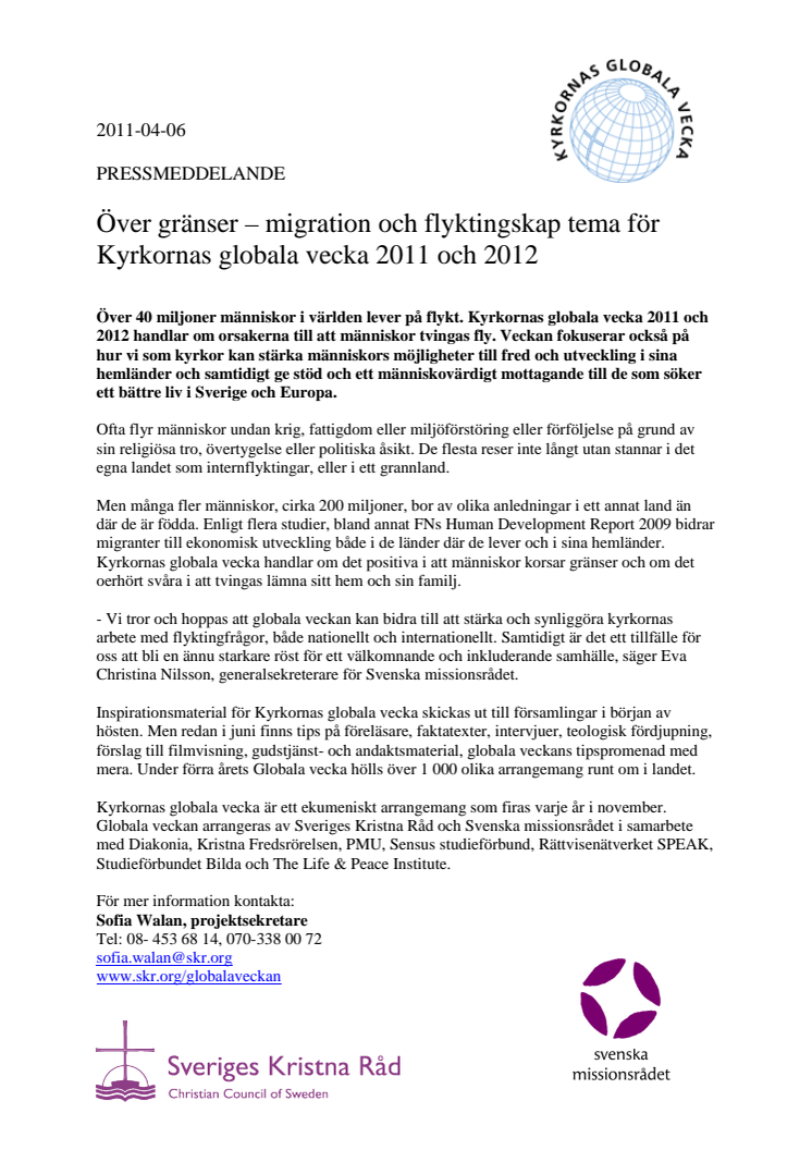 Över 40 miljoner människor i världen lever på flykt. Kyrkornas globala vecka 2011 och 2012 handlar om orsakerna till att människor tvingas fly. Veckan fokuserar också på hur vi som kyrkor kan stärka människors möjligheter till fred och utveckling i sina hemländer och samtidigt ge stöd och ett människovärdigt mottagande till de som söker ett bättre liv i Sverige och Europa.