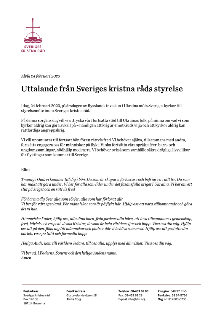 Idag, 24 februari 2023, på årsdagen av Rysslands invasion i Ukraina möttes Sveriges kyrkor till styrelsemöte inom Sveriges kristna råd och har formulerat ett gemensamt uttalande.