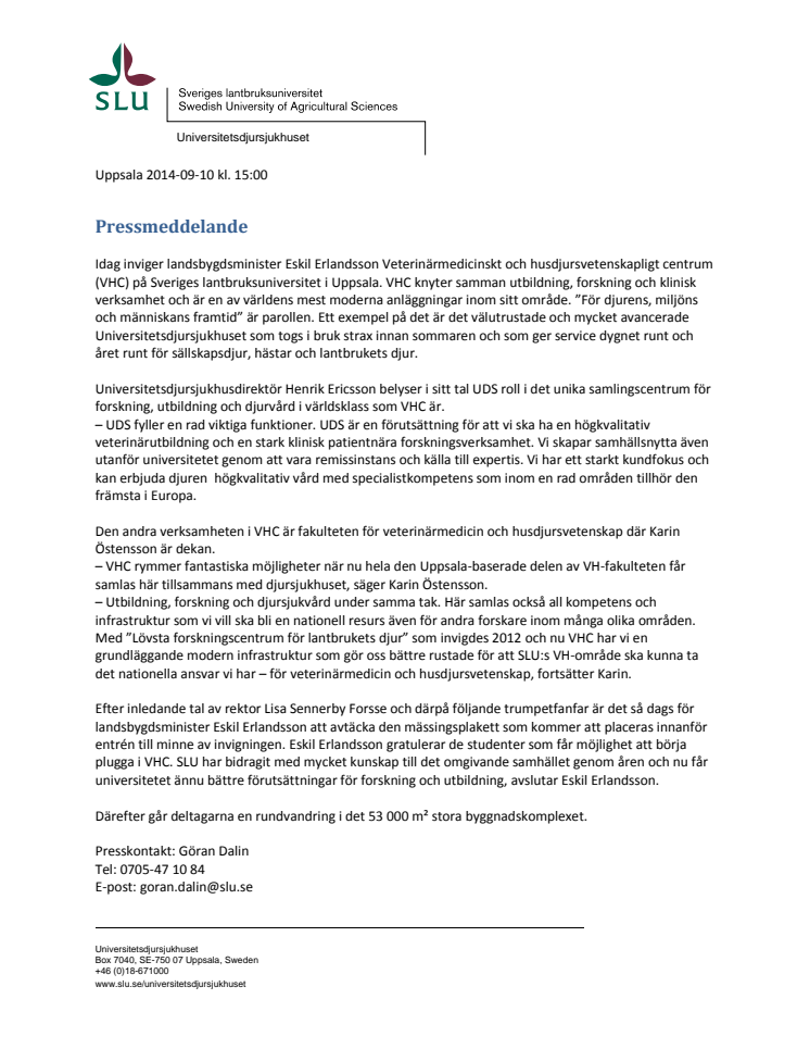 Idag inviger landsbygdsminister Eskil Erlandsson Veterinärmedicinskt och husdjursvetenskapligt centrum.