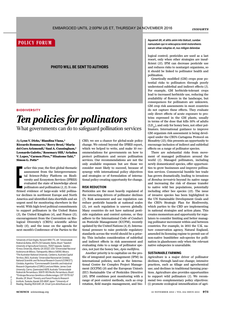Det är dags för världens regeringar att agera kraftfullt för att skydda pollinatörerna och därmed produktionen av mat, anser en internationell grupp av forskare som i senaste numret av den vetenskapliga tidskriften Science ger tio förslag på vad samhället kan göra.