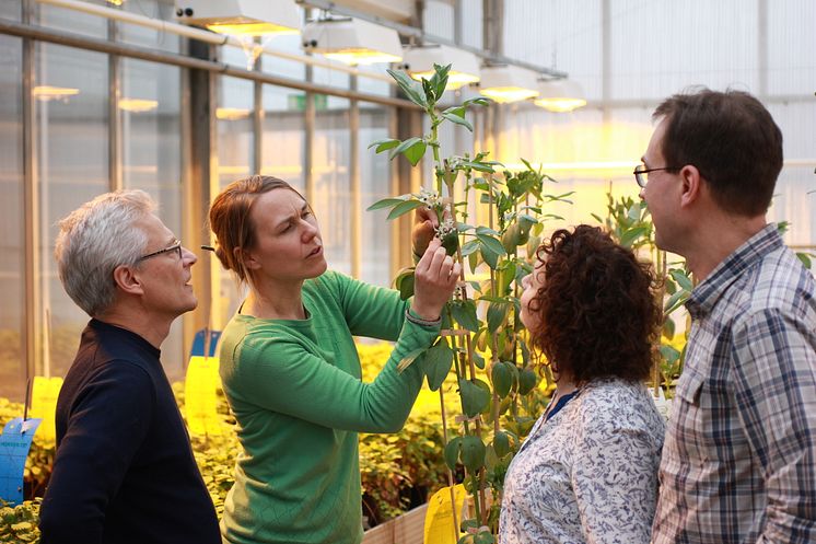 SLU-forskaren Åsa Grimberg (andra fr v) granskar en fvabönplanta tillsammans med kollegorna Per Hofvander, Cecilia Gustafsson och Anders Carlsson.
