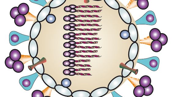 Schematisk bild av ett fågelinfluensavirus med dess strukturella komponenter (s. 13 i avhandlingen). Illustration: Muhammad Munir