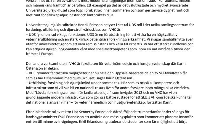 landsbygdsminister Eskil Erlandsson att avtäcka den mässingsplakett som kommer att placeras innanför entrén till minne av invigningen. Eskil Erlandsson gratulerar de studenter som får möjlighet att börja plugga i VHC. SLU har bidragit med mycket kunskap till det omgivande samhället genom åren och nu får universitetet ännu bättre förutsättningar för forskning och utbildning, avslutar Eskil Erlandsson.