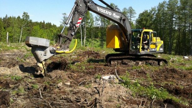 - Maskinell plantering med grävmaskin och kranspetsmonterat Bracke Planteraggregat. Foto: Back Tomas Ersson