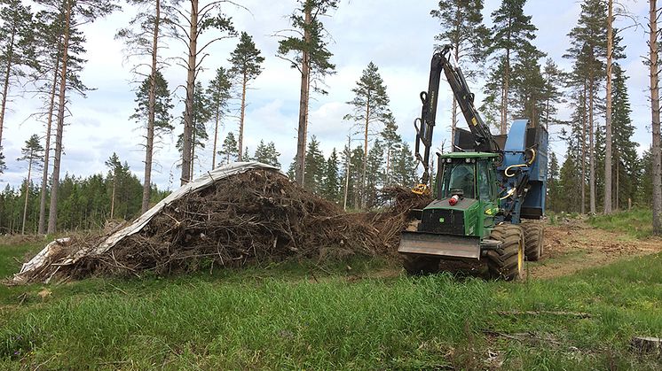 - Flisning av grot, dvs. hyggesrester i form av grenar och toppar. Foto: Stefan Löfgren