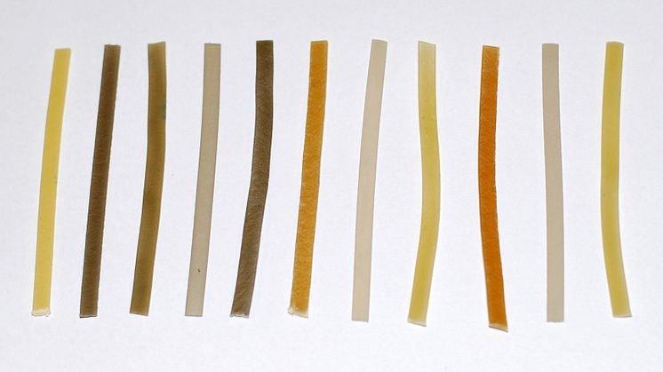 Material tillverkade av växtproteiner och modifierad potatisstärkelse. Färgskillnaderna beror på komponenterna i blandningen (ingredienserna) och vid vilken temperatur plasten tillverkats. Foto: Faraz Muneer.