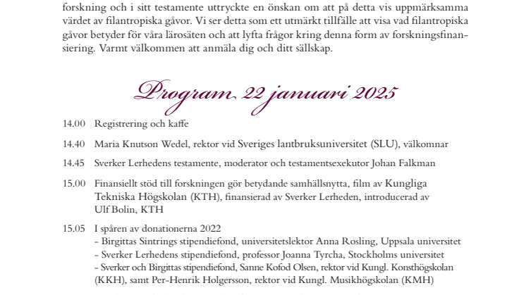 Under eftermiddagen kommer vi att lyfta fram hur filantropiska bidrag har en avgörande betydelse för att främja vetenskap och kultur. Program och talare finns bifogat.