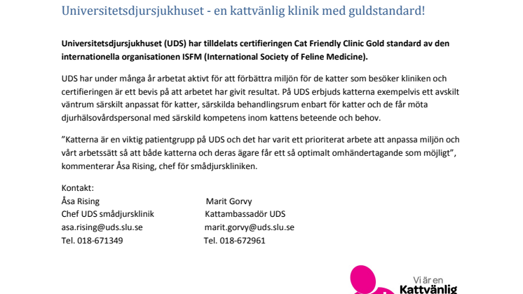 UDS har under många år arbetat aktivt för att förbättra miljön för de katter som besöker kliniken och certifieringen är ett bevis på att arbetet har givit resultat. På UDS erbjuds katterna exempelvis ett avskilt väntrum särskilt anpassat för katter, särskilda behandlingsrum enbart för katter och de får möta djurhälsovårdspersonal med särskild kompetens inom kattens beteende och behov.